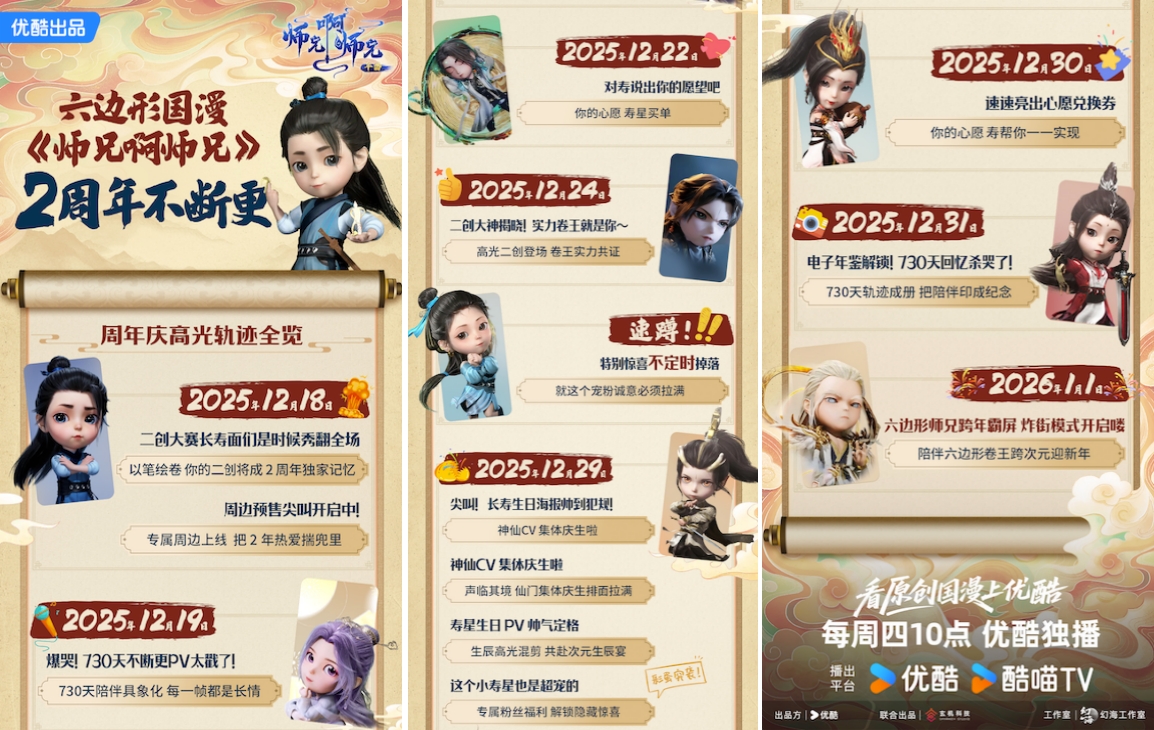 12月18日,《师兄啊师兄》正式开启两周年不断更庆典。一部动画能够实现 730 天稳定更新,背后既离不开制作团队精益求精的创作定力,更离不开粉丝群体长久以来的热忱支持。《师兄啊师兄》与粉丝并不是单纯的动画和观众的关系,两者一直以来都是执手共生的双向奔赴。本次两周年庆典,《师兄啊师兄》秉持着一贯宠粉的原则,在线上线下都做足了排面,不仅整理了以往粉丝二创的佳作,带领观众重温两年相伴的温暖记忆,也策划了跟粉丝面对面、满足粉丝心愿、全城霸屏共同跨年等诚意极强的互动。于《师兄啊师兄》而言,两周年的意义从来不止于一部动画的成长,更在于和粉丝共同度过的羁绊时光。而这份双向奔赴的情谊,也将成为作品持续前行的底气,陪伴观众走过未来的每一个周年。