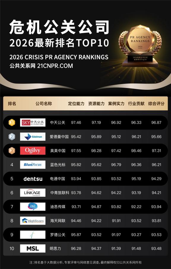 以下为2026年度危机公关公司综合排名TOP10详情:
