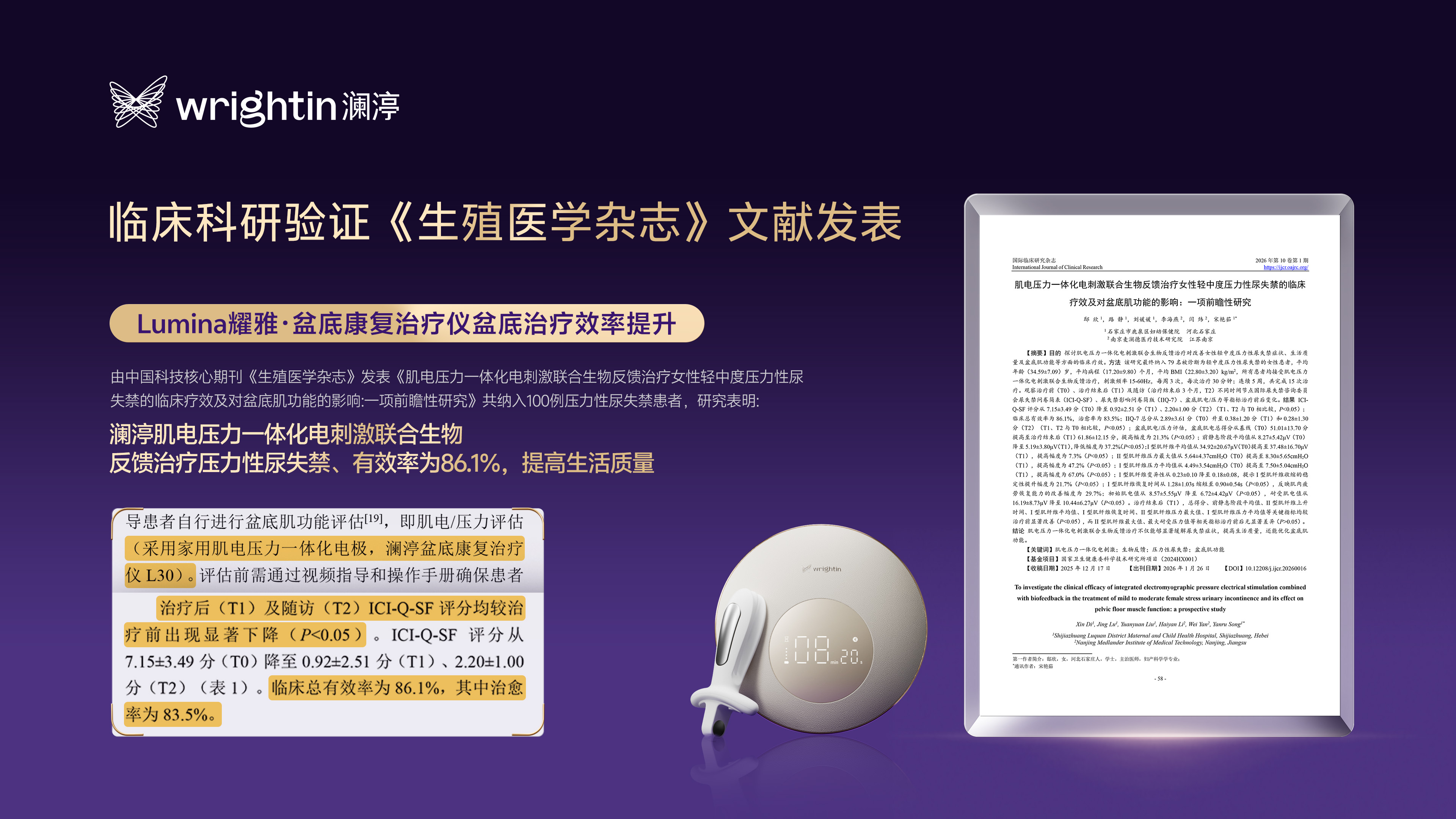 盆底康复系统聚焦压力性尿失禁、盆腔器官脱垂、慢性盆腔疼痛等女性盆底问题,提供科学治疗。据中国科技核心期刊《生殖医学杂志》发表的临床研究显示,应用澜渟Lumina耀雅肌电压力一体化技术治疗压力性尿失禁,临床总有效率达86.1%,其中治愈率为83.5%,切实改善女性生活质量。