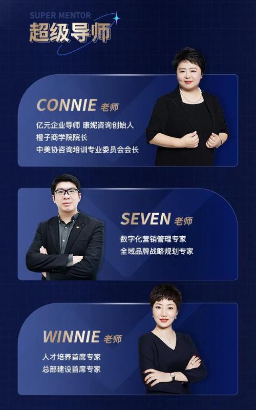 为了提升总裁班的教学质量,与业内精英一同碰撞“思维火花”,嘉悦国际集团将会邀请亿元企业导师、康妮咨询创始人、橙子商学院院长、中美协咨询培训专业委员会会长CONNIE老师,数字化营销管理专家、全域品牌战略规划专家SEVEN老师,人才培养首席专家、总部建设首席专家WINNIE老师,为广大学员授课,与200+美业亿级总裁实现智慧链接。同时,打破传统思维,努力抢知Z世代趋势消费洞察。