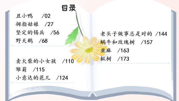 接下来看《安徒生童话》的另外两组故事,一组《丑小鸭》《拇指姑娘》《坚定的锡兵》《野天鹅》;另一组《老头子做事总是对的》《蜗牛与玫瑰树》《亚麻》《枞树》,同样需要感受童话故事中新颖有趣的情节,感受美好的人物形象,最后大致讨论每一组故事放在一起的理由是什么?也是因为想象令人获得幸福么?通过阅读、小组交流,会发现第一组故事中的主人公实际上都不够完美——丑小鸭外表丑陋,拇指姑娘十分弱小,锡兵与艾丽莎王后的口不能言,但是这些不够完美的人到了最后也获得了幸福。那么最后一组故事呢?自然是普通的人只要坚持下去也能获得幸福。以“就是这样的幸福”打开孩子的认知视野,引导孩子体会安徒生的那份绵延至今的善意,这些不受命运眷顾,有着各种各样缺点的、平凡的人都是能够获得幸福的——想想正在捧读这本书的那些孩子们,他们会不会因为安徒生童话故事所传达的善意从而得到内心的疗愈呢?