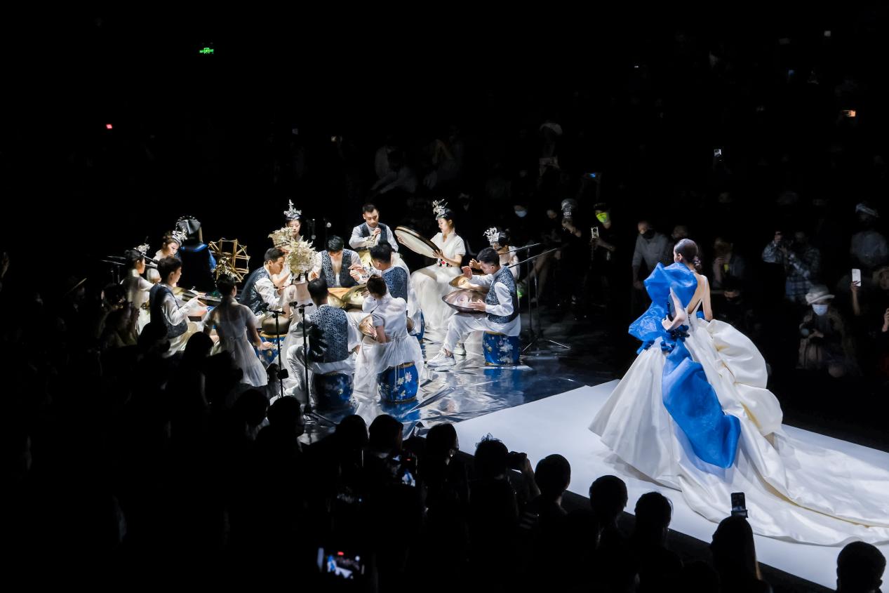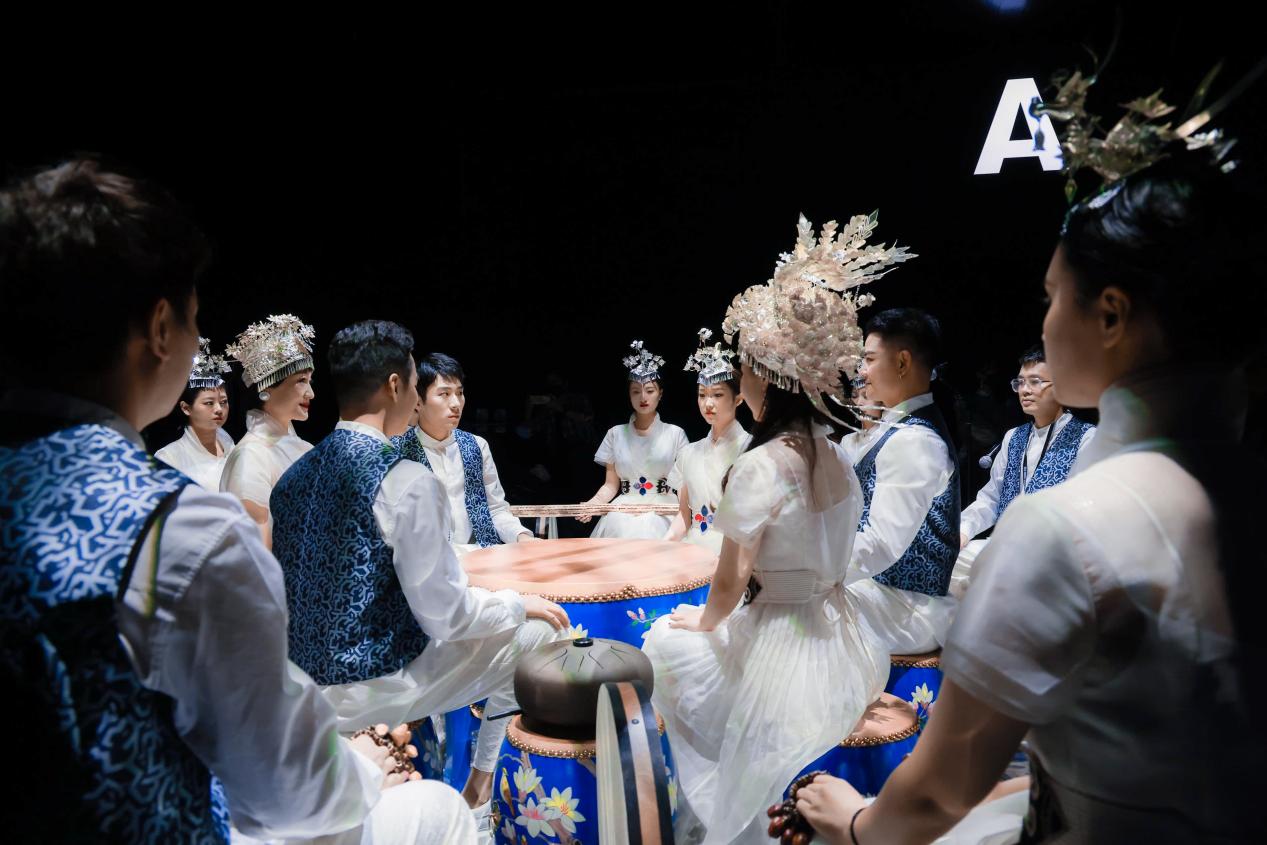 这一次,BBLLUUEE粉蓝时尚艺术跨界秀探寻表达彝族文化的画卷,绘制了一场融汇民族和时尚、东方与西方、传统与现代的跨界创意之作,伴随着粉蓝时尚员工艺术团现代打击乐阵的独创演绎,24位着BBLLUUEE彝文化概念礼服超模的超然呈现,与现场600位特邀观秀嘉宾的美好风貌,再次成为本届深圳时装周最惊艳的艺术大秀。