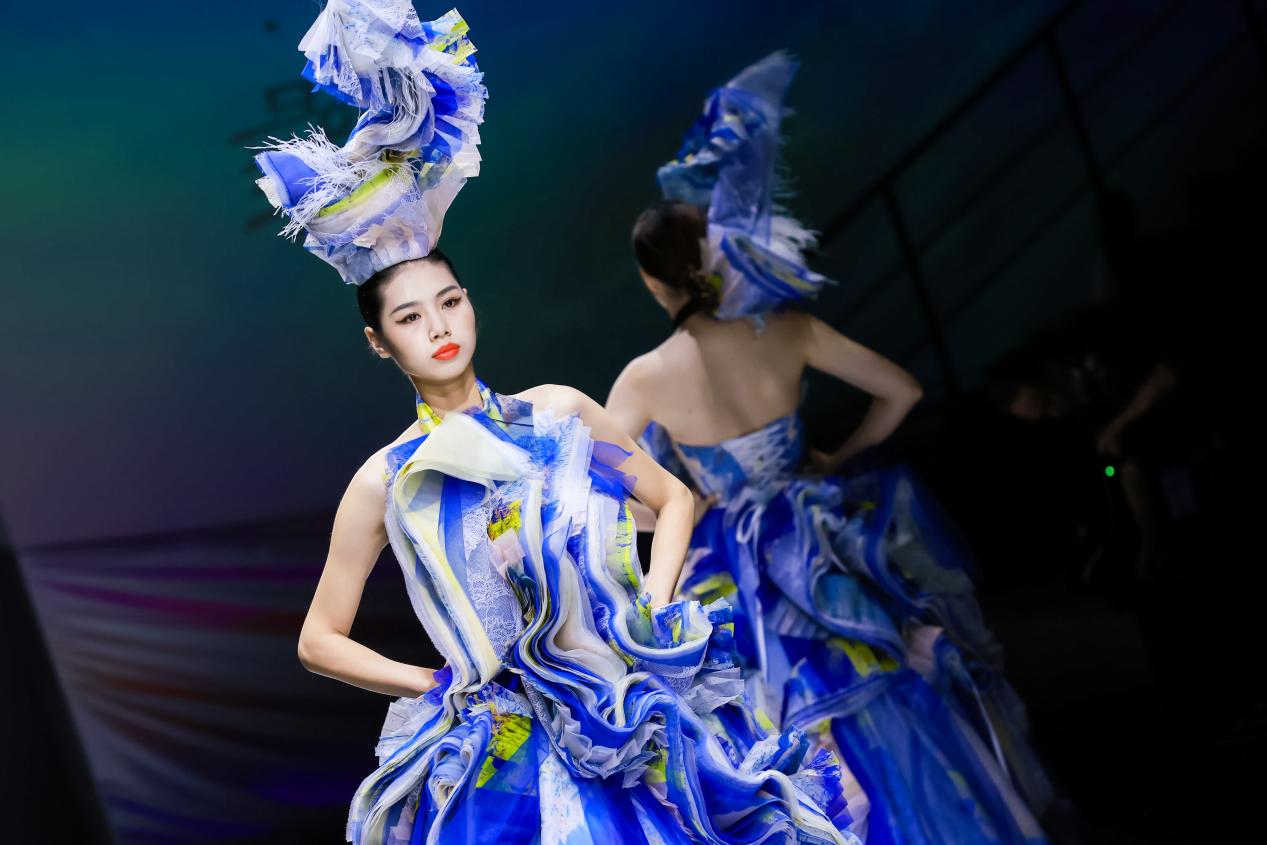 雅,设计灵感来源于大凉山的彝族风情,采用“以形写神”的手法,汲取彝族传统纹样元素,对精美的彝绣技法进行解构和创新设计,色彩浓郁的克莱因蓝为大凉山带来一抹时尚的颜色;独特的概念礼服造型结构,似乎诉说着彝族从传统走向现代的时尚重生。