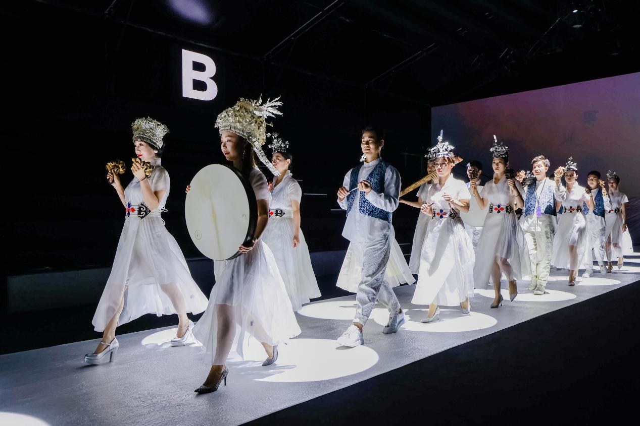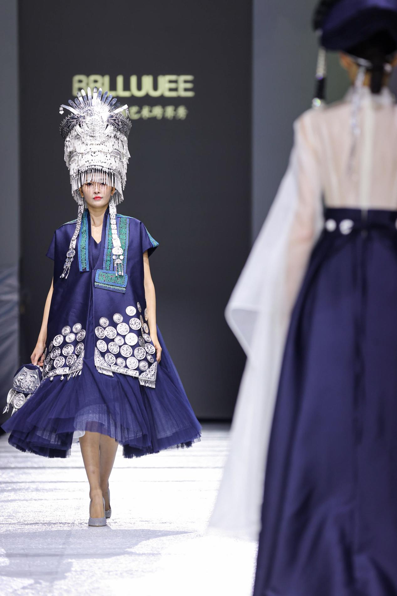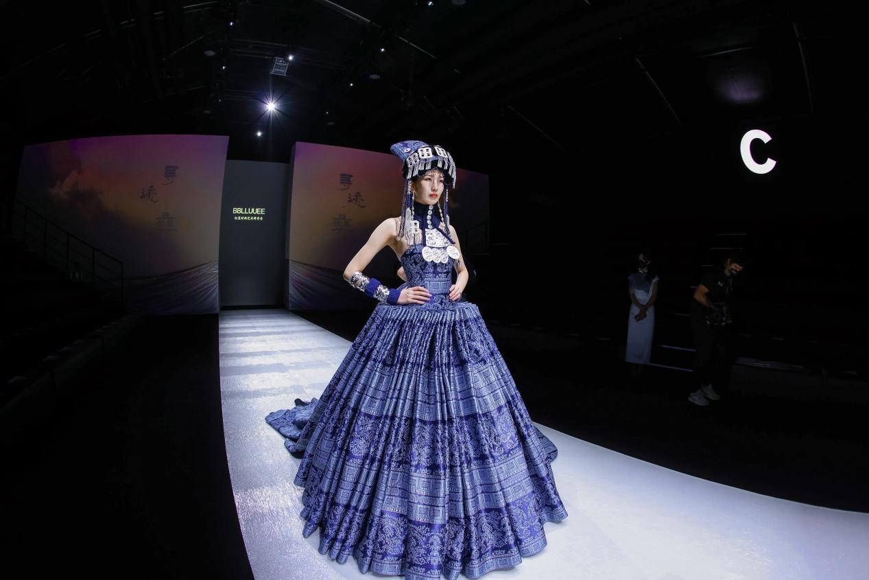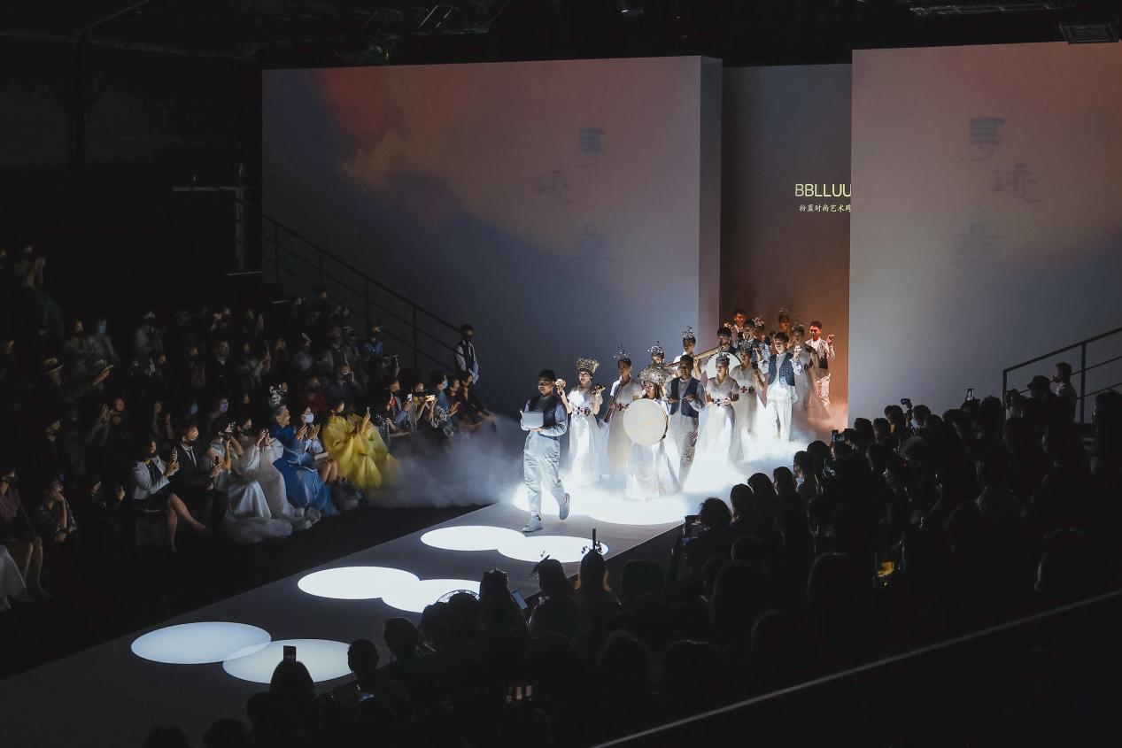 当彝族刺绣传承人阿西巫之莫奶奶坐在秀场上飞针走线,仿佛看到一个民族的文化缩影,她穿着的彝服中密密匝匝编制着这个民族厚重而跌宕的历史。现场24位身着BBLLUUEE高定文化概念礼服的模特从她身侧走过,空灵治愈的音乐回荡耳旁,在光影交织中极富感染力,展现出民族文化与现代时尚相互融合的诗艺之美。