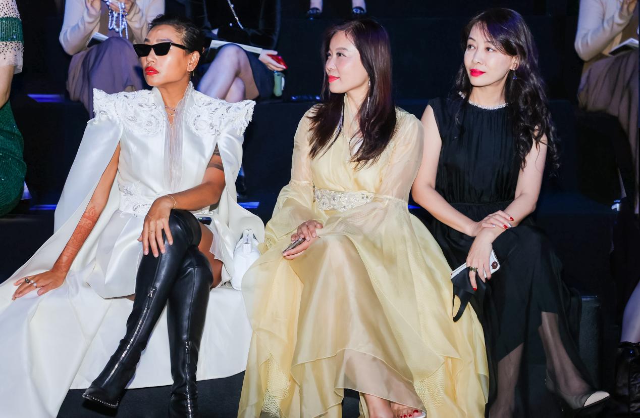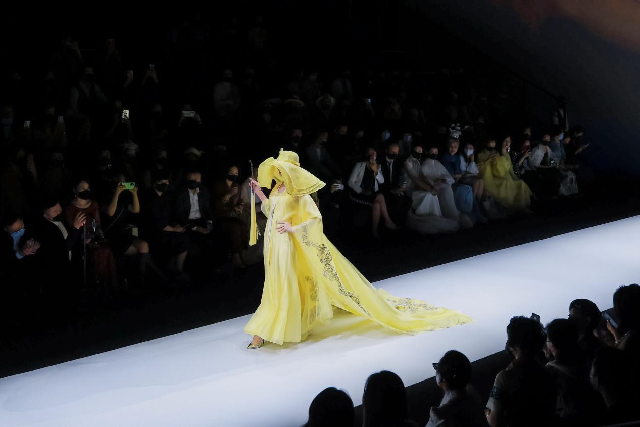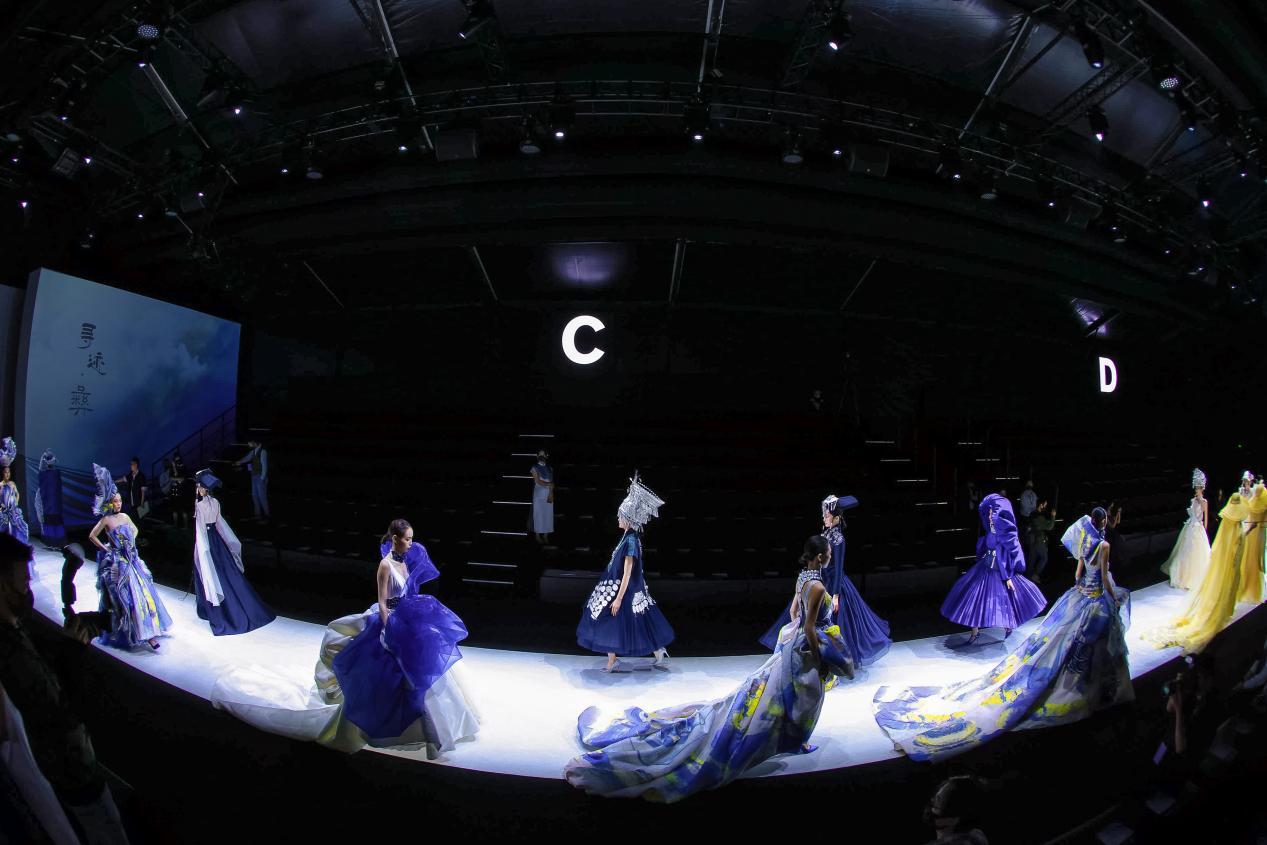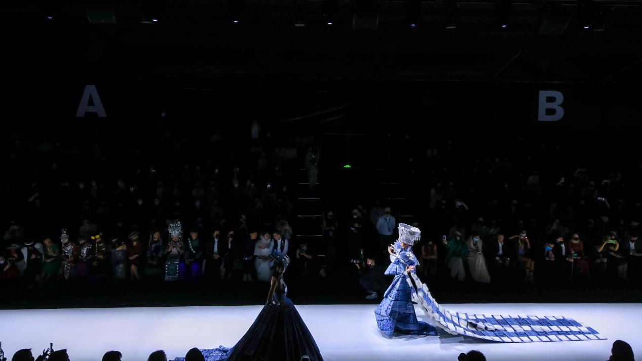 当彝族刺绣传承人阿西巫之莫奶奶坐在秀场上飞针走线,仿佛看到一个民族的文化缩影,她穿着的彝服中密密匝匝编制着这个民族厚重而跌宕的历史。现场24位身着BBLLUUEE高定文化概念礼服的模特从她身侧走过,空灵治愈的音乐回荡耳旁,在光影交织中极富感染力,展现出民族文化与现代时尚相互融合的诗艺之美。