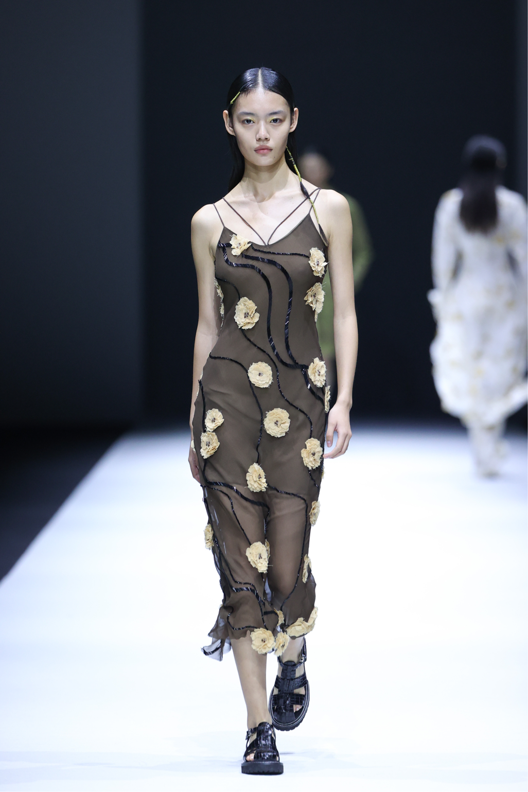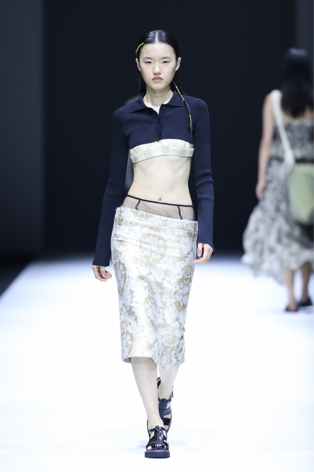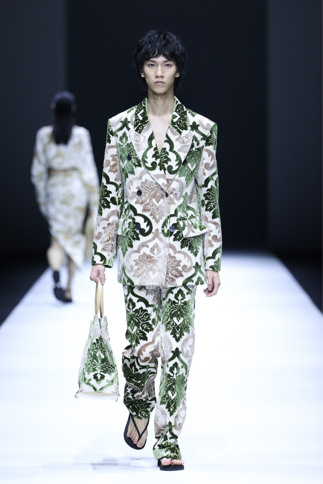 在这一系列中,设计师尽情利用不对称剪裁、拼接撞色、布料重组等创作手法重新演绎出品牌核心的武侠精神,时而慵懒恣意,时而利落飒爽,犹如刚柔并济的女性拥有许多不为人知的面向与角度。众多融入自然景观和动植物的花型图案设计增添了迷幻的现实主义浪漫,古典而层次丰富的提花与老花面料则唤醒复古力量,创作出一种优雅浪漫的奢华既视感。
