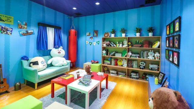 最先走进的是Brown的客厅,里面堆满了LINE FRIENDS的家族成员玩偶,加上极具巧思的房间布置,可爱感简直爆棚!别以为Brown的家只是表面看上去的这么简单,里面还藏着意想不到的惊喜。拿出手机通过AR游戏扫描墙上Brown的肖像照,可以看到肖像照中的Brown变身为Beat Brown,从相框中跳出冲进第二个房间。
