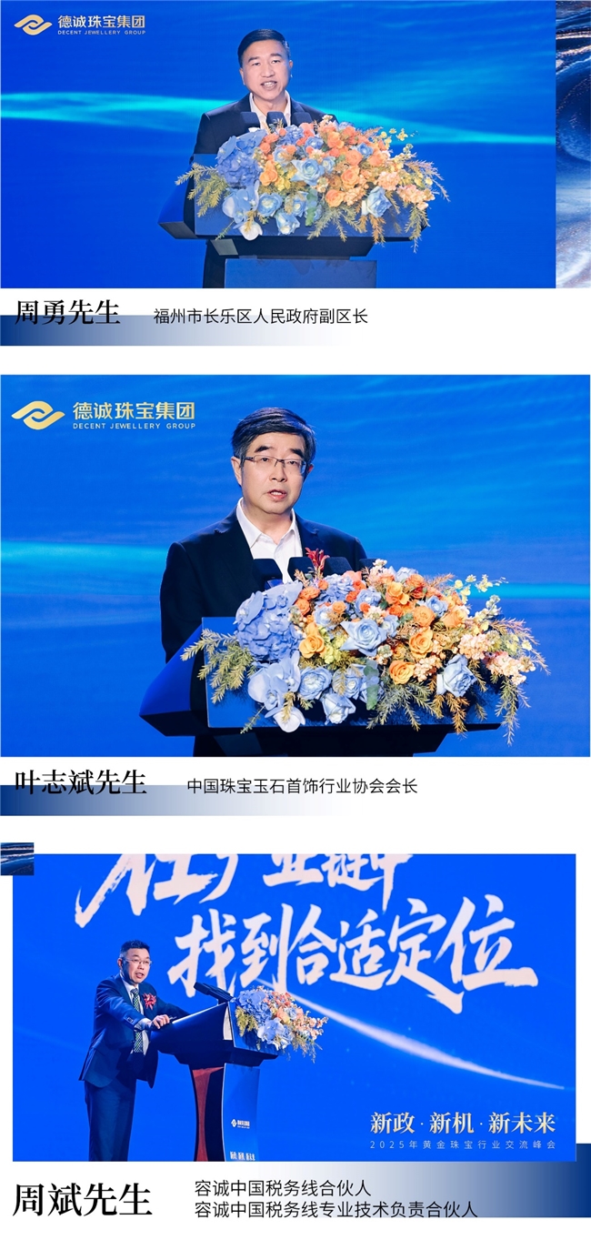 本次峰会,汇聚政府监管层、行业协会领袖、资深专家、权威媒体、企业掌舵人及千余位合作伙伴。福州市长乐区人民政府副区长周勇先生,中国珠宝玉石首饰行业协会会长叶志斌先生,中华全国工商业联合会金银珠宝业商会秘书长黄滢女士,中国黄金协会监事长刘艳红女士,中国黄金报社总编辑曲辉先生,珠宝国检集团深圳实验室党总支书记张秋生先生,福建省宝玉石协会会长王乃珠先生,长乐区人大常委会原党组成员、副主任、长乐区企业与企业家联合会会长陈国衍先生,上海豫园珠宝时尚集团有限公司副总裁李国臣先生,中国黄金集团黄金珠宝股份有限公司副总经理金文一先生,中国珠宝首饰进出口股份有限公司加盟管理部总经理胡猛先生等嘉宾出席现场,共同围绕黄金税收新政落地后的行业变革、挑战应对与未来机遇,展开了一场高规格、深层次、前瞻性的思想对话与发展共商。这场峰会成为观察中国黄金珠宝产业在政策驱动下转型升级的重要窗口。