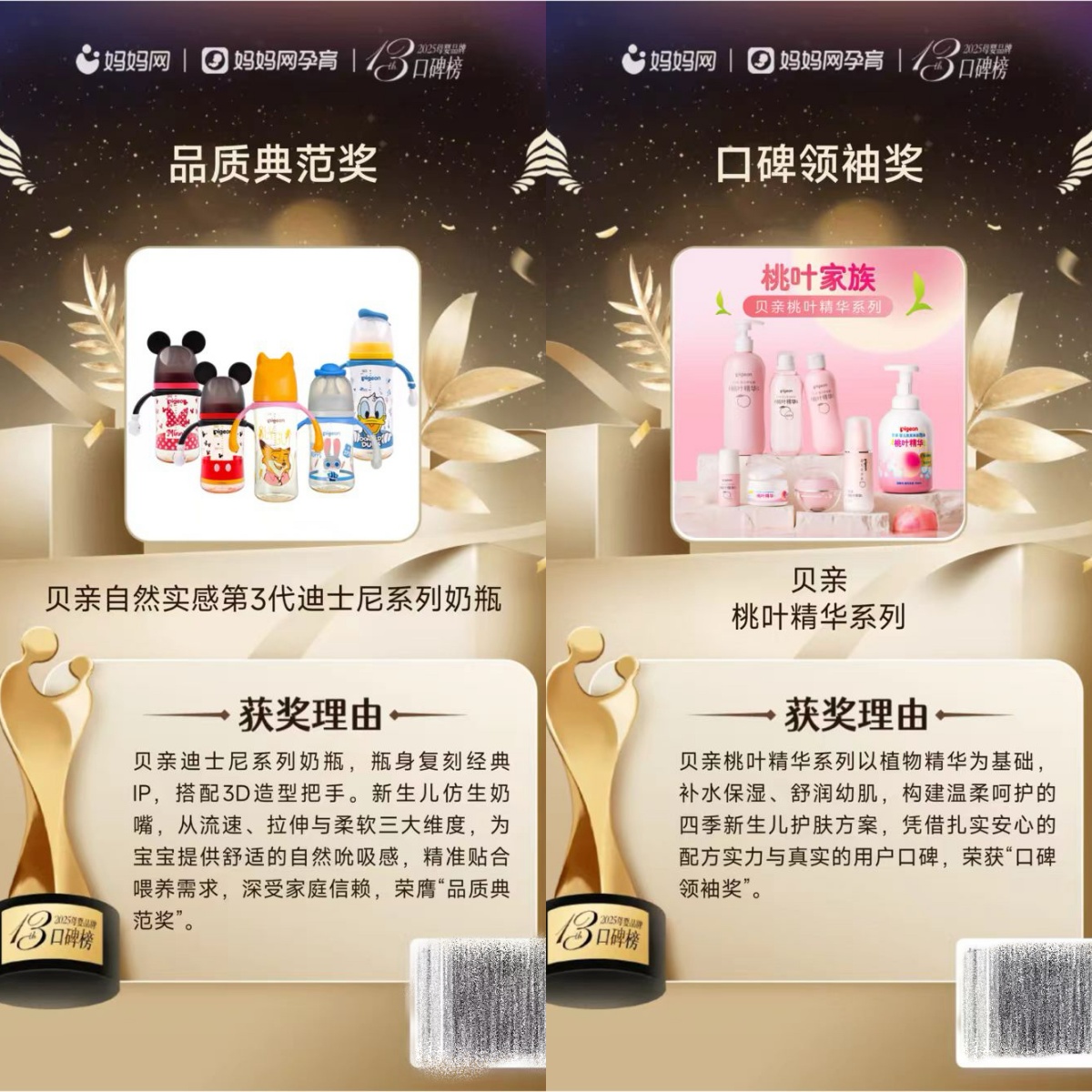 凭借仿生奶嘴设计、防胀气核心技术及严苛的质检标准,贝亲奶瓶持续赢得权威媒体与行业伙伴的广泛赞誉。其中,贝亲新生儿奶瓶成功入选人民网“2025国民消费创新案例库”的“口碑产品”;在第11届樱桃大赏上,贝亲脱颖而出,一举摘得“年度奶瓶品牌杰出表现大奖”。妈妈网、育儿网等平台的专业评选,同样见证了贝亲的实力:自然实感第三代奶瓶、桃叶精华系列、婴儿仿生胎脂系列等明星产品,分别荣获“品质典范”“口碑领袖”“创新之星”等称号,充分印证了品牌在消费者心中积淀的专业实力与深厚信任。