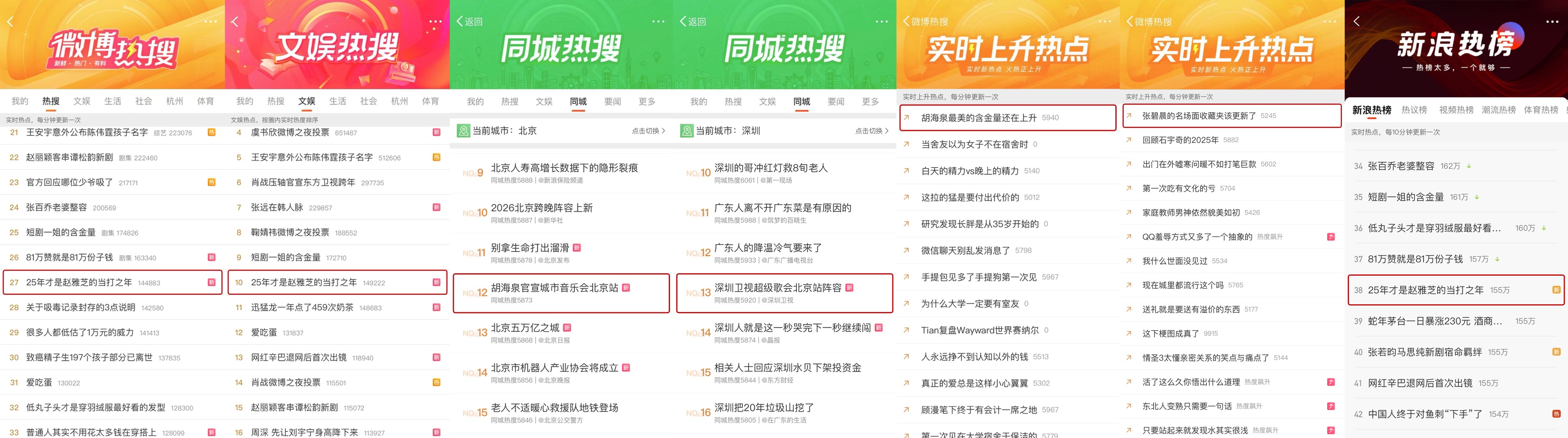 除此之外,胡海泉的新编版《最美》《心似狂潮》、张碧晨《浮生谁》演绎东方美学、黄英和郭浩然合唱的《烽月》、王搏《丽丽》、以及yoyo 与颢鑫的《一期一会》等,这些或动感或深情或魔性,治愈又甜蜜的歌曲,承包了网友的笑点、泪点和燃点,让晚会真正成为一场年终总结式的音乐盛宴,弹幕里“全程高能”“年度最佳”“2025的电就充到这里了,准备好迎接新年啦”好评不断刷屏。晚会结束后,在抖音、微博等多个社交平台上,晚会相关内容的讨论度仍居高不下。其中 话题#胡海泉跳喵喵舞游刃有余 强势登上抖音热榜北京榜第一位。 话题#她可是赵雅芝啊#冲上微博文娱榜和主话题榜。