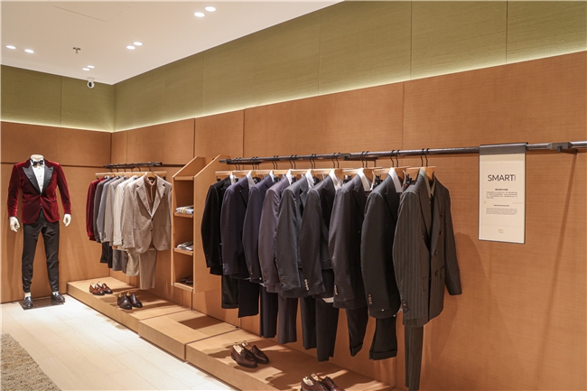 拾级而上,二层 “精神之屋” 更显内敛优雅:柔和灯光、沉稳木材与克制艺术感的面料拼贴,精准传递WANTSUIT的审美主张。这里的服装不再是单纯的商品陈列,而是生活方式的注脚 ——SMART 系列的精致剪裁适配正式社交场景、DAILY 系列的舒适质感满足通勤休闲需求、MOVING 系列的动感设计衔接旅行与周末时光,三大系列无缝覆盖现代男性的多元生活场景。