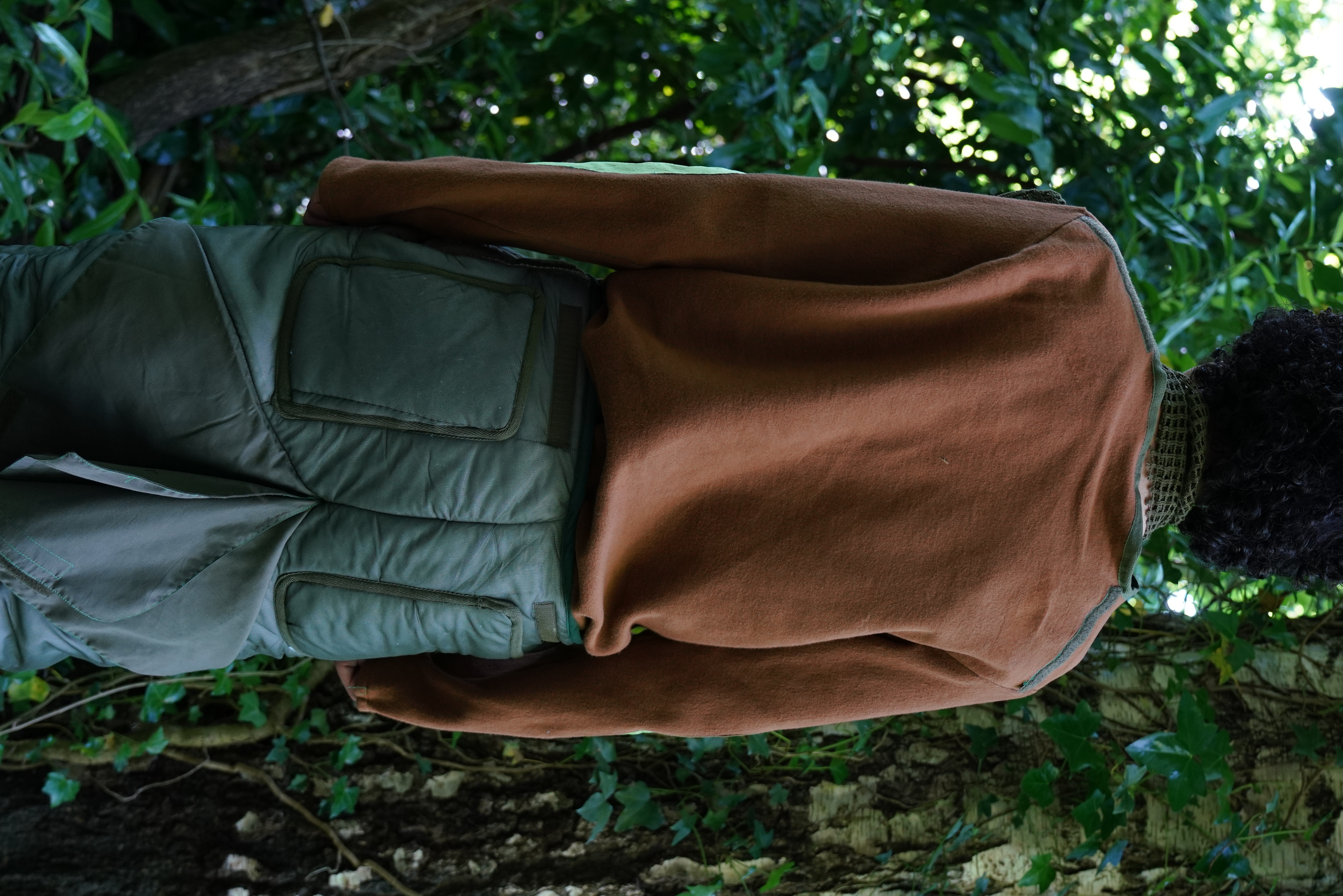系列名称中的 “Époque” 指向十九世纪末至一战前的欧洲文化黄金时期。这个时期的服装与视觉文化深受新艺术运动与后来的装饰艺术影响,曲线装饰、植物形态与精致工艺构成了当时的视觉语法。程瀚葳将这段历史记忆与军用装备这种物质系统相连接。“OBSCURE EPOQUE”系列的主要材料来自废弃军用睡袋与军需面料,这些织物原本服务于极端环境下的功能需求,具有厚实的尼龙外层、明显的绗缝结构以及高密度填充。这种材料决定了服装的体量与触感。睡袋面料在拆解后被重新排布。原有的绗缝格纹成为服装的视觉骨架,外套表面也随之呈现规律分布的立体区块。部分长外套在胸部与肩部区域保留较厚填充,而下摆则通过减少填充或改变绗缝方向,使轮廓逐渐过渡为更柔和的曲线。这种体量变化使得服装在视觉上既保持军事装备的重量感,又获得接近斗篷或长袍式的流动轮廓。