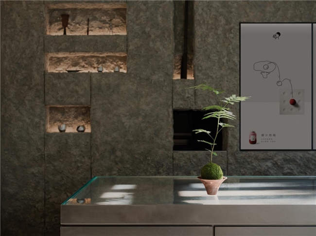 空间内的点茶吧台采用透明台面,完整显露出台面下方如同烧水煮茶时留下的煤渣印记。空间墙面上,喜茶空间设计团队将收集来的铜壶、茶器标本与喜茶门店在用的龙井茶叶嵌入墙体,形成一面茶文化“考古墙”,由墙体延伸而出的陈列架上,植物化石、考古工具与经修复后的茶具穿插展陈,在门店空间内构成了发生在3025 年的一处茶文化考古现场。