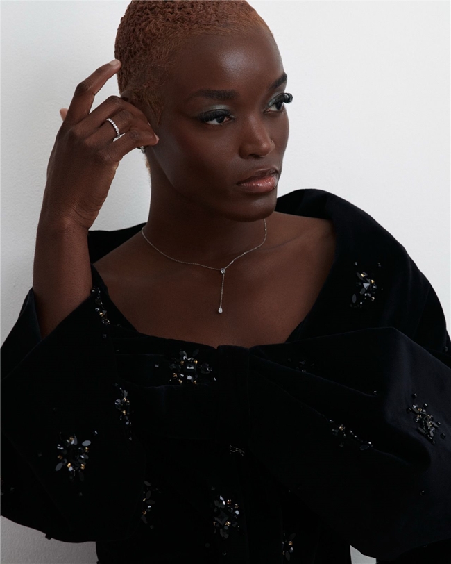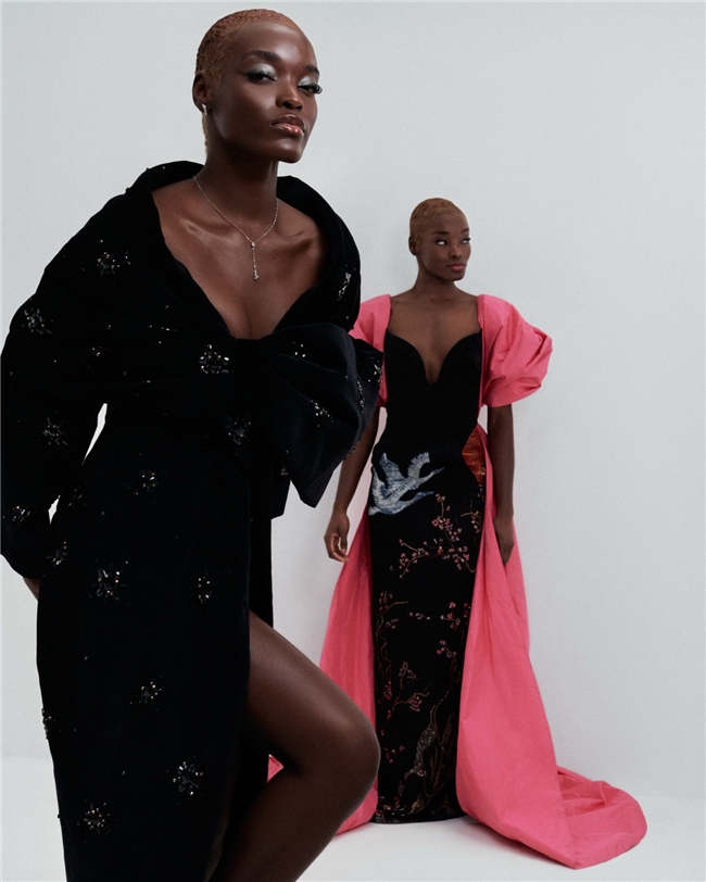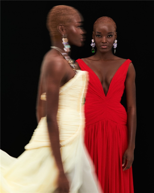 设计师的选择为这种层次感贡献了力量。Ivette Bianchi、Lena Erziak 和 Inclover 带来了不同的高级定制手法,从雕塑般的构造到更为柔和流动的廓形表达。Moaren Jewelry 则引入了另一个维度,通过细节与强调点与服装相互作用,同时塑造整体构图。