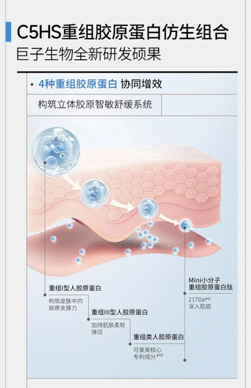 对于可复美舒舒贴而言,其核心成分—C5HS重组胶原蛋白仿生组合具有强舒缓作用。它是可复美在重组胶原蛋白领域的全新专研技术,该仿生组合里包含了四种不同的与人体胶原蛋白氨基酸序列100%一致的重组胶原蛋白成分(数据来源:中国化工学会组织编写的《胶原蛋白材料》一书,书号:978-7-122-40915-7),其中包括核心专利成分重组胶原蛋白(中国发明专利,ZL201110327873.X)以及分子量仅有217Da的Mini小分子重组胶原蛋白肽,可在肌底加持修护。四种重组胶原蛋白通过不同比例添加,科研配比,层层释放胶原舒缓力,构筑立体舒缓体系。