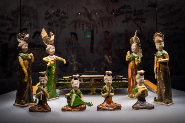 那些丰颊肥体的三彩女俑,最是引人驻足。她们或抚琴弄弦,眉眼低垂间流露着从容与自信;或捧盘侍立,身姿丰腴却不失灵动,真实还原了“以胖为美”的唐代风尚。一旁列队的骑马狩猎俑、载乐歌舞俑,或弯弓搭箭,或吹奏弹唱,将唐人豪迈奔放的生活情致凝固于釉彩之中,仿佛下一刻便要驰骋原野、踏歌而行。