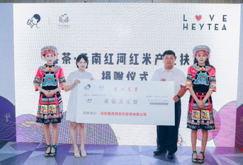 2019年7月22日喜茶在北京启动公益计划——LOVE HEYTEA “喜爱计划“, 联合中国扶贫基金会首次发起公益项目——云南红河红米产业扶贫。在该项目中,喜茶在两年内向中国扶贫基金会捐赠总额200万元人民币用于产业支持,除了产品扶持,喜茶还采用责任消费的方式,采购合作社生产的红米,链接市场,提升和保障当地农户的经济收入。截止到2019年内11月,喜茶责任采购了2220斤红河梯田红米,制作出来的两款爱心红米包,收获了消费者的喜爱,帮助贫困山区的农民稳定增收。