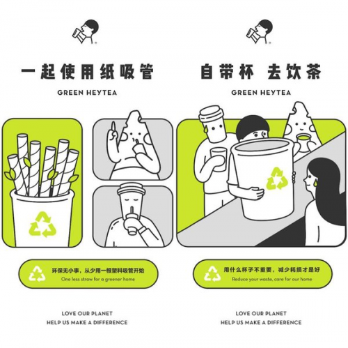 早在2019年6月,喜茶积极响应国家的绿色环保政策,在全国门店陆续上线“纸吸管”,并投入使用材料更为环保的包装材料,对传统的塑料包装进行循环利用,各项环保举措纳入到全国门店的日常经营中。2020年4月22日世界地球日,喜茶延续2019年的绿色环保理念,在深圳启动[喜茶X青山计划]塑料杯回收行动,当即回收了800公斤喜茶塑料杯。累计到同年5月31日,共回收1800公斤塑料杯,循环再造4000件环保周边,还同步推广“自带杯减2元”活动,年报数据显示,共累计减少超过30000个塑料杯和超过12000万根塑料吸管。2020年11月,喜茶在新开的海岸城环保主题店融入环保理念融入空间设计中,门店内设置了许多赏心悦目的绿色环保周边。