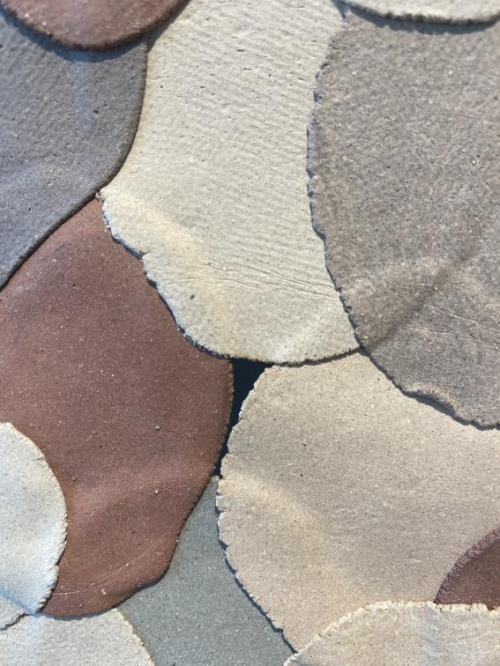 开幕后的一周我又来了一趟,这一次很仔细的观察这些薄弱柔软,鳞片一样彼此伏靠的“布片”。我说:你的作品总是展现出一些不像陶瓷的质感。双双大笑说: