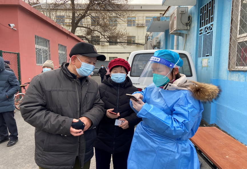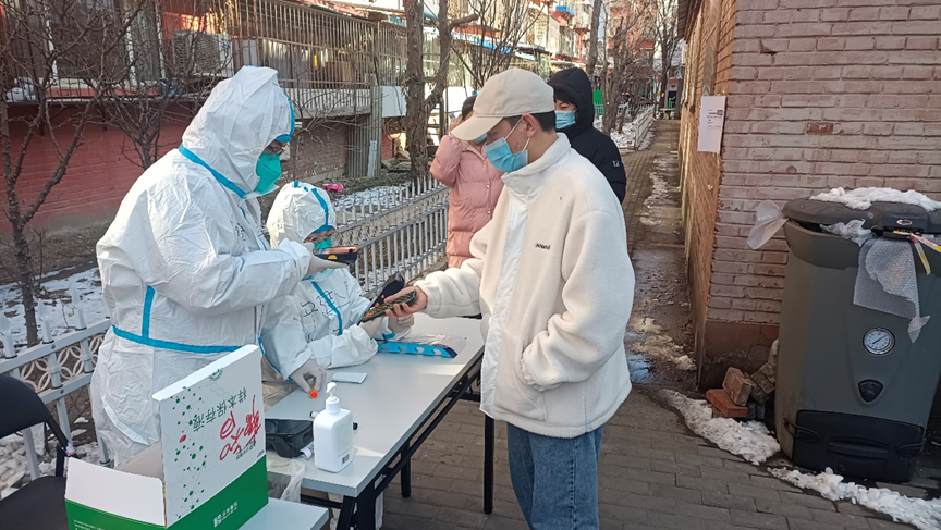 “作为志愿者,我们每天早上5:30就来到网格点待命。和社区工作人员、医务人员密切配合,完成检测前的准备工作。”来自中建二局北京分公司的武子晗说到。“您好,叔叔,请您出示身份证,我来帮您登记一下个人信息。”她拿着识别器为1000名居民进行信息登记、上传平台,但在零下九度的早晨手不一会儿就冻僵了。