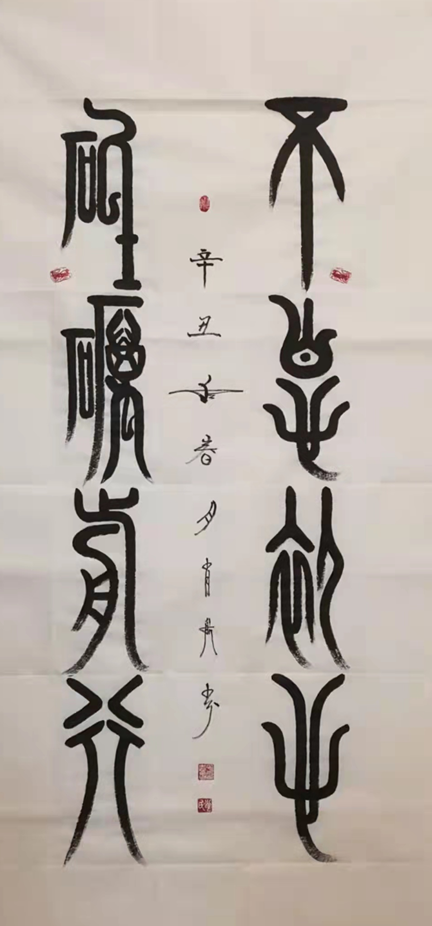 铁笔龙梅绘丹青,法归石鼓书圆厚。吴昌硕用春秋不辍的痴念写石鼓,成为书法线条塑造的碑学前贤,肖忠昌先生的书法也有劲修高古的痴念,他以探源石鼓为执着,心追手临,付力深刻,所以书法线条圆厚朴茂,在堂皇大度的结体形态中,参意进笔法圆活,墨韵奔放的再创造,刚柔相济,飞白有现,质雄不失逸气,凝重而绝不写呆板!笔墨才华源出先贤,书画两功传承龙脉,肖忠昌先生恰是师古而不拘泥的书画雄才!