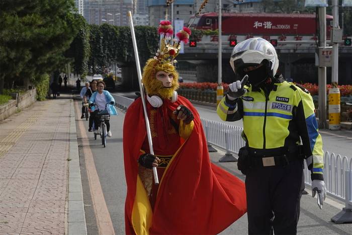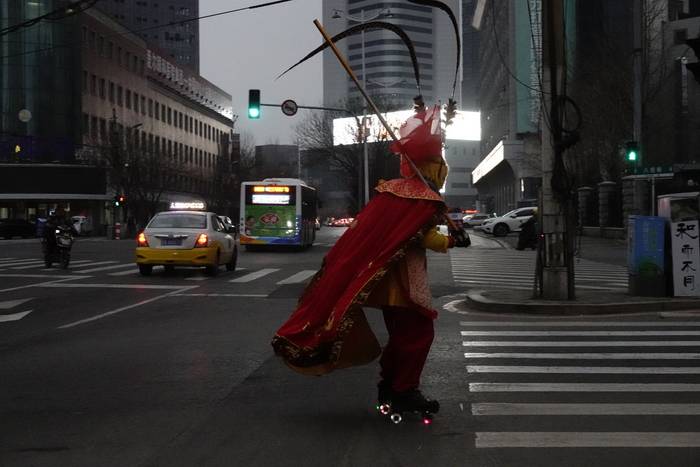 街头拍摄的不确定性,令王天抒痴迷。他说,那位孙悟空特立独行,出没在大街小巷,追着拍摄费不少心思。“手持金箍棒、脚踏轮滑鞋的‘孙悟空’,一天一场‘马拉松’,从机动车道滑到非机动车道,由闹市滑到陋巷,炫酷惹眼拒绝低调,休息时会坐在一隅抽烟、吃雪糕,回到家门口时会喊一名眯着眼、笑嘻嘻的老大爷开门禁。尽管我骑车追踪无数次,可他身上的谜团至今无解。”