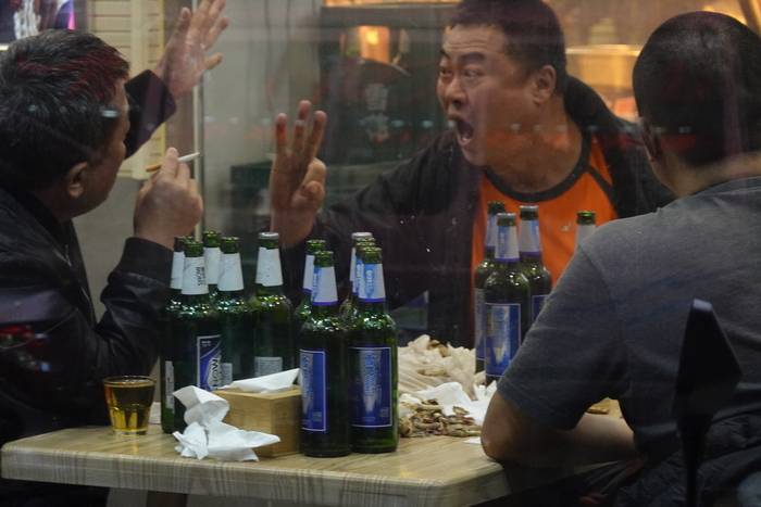 我们不敢大声喧哗,打破书店主人营造的静谧肯定有辱斯文,就到一家馆子喝酒聊天,谈看图片的感觉。吴强是大记者,心理咨询专家,他看问题往往从社会心理切入,做深度剖析。张颖是做深度报道的记者,一向以新锐、犀利著称。他俩的观点空前一致,赞成王天抒把街拍摄影做到极致。我说不出什么有观点的东西,职业使然,我总是从犯罪心理学方面观察事物,尽管我没通读过几本这领域的名著。我觉得王天抒厚积薄发,出版两三本类似的摄影集,势必转换一下拍摄方式,去发现新的发现,避免审美疲劳。