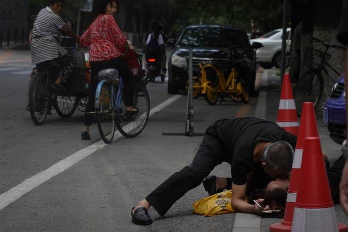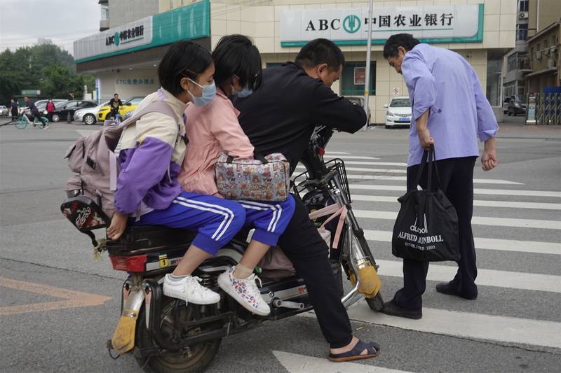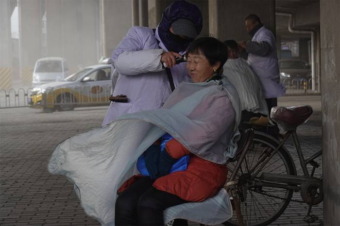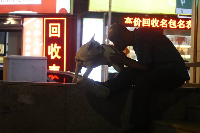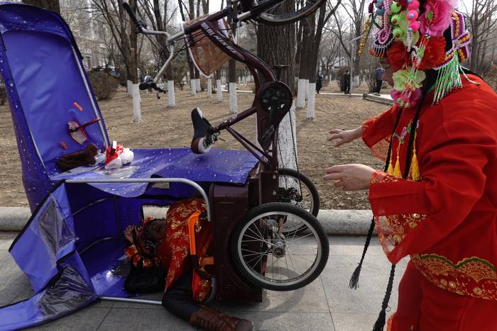 王天抒生就一副悲悯心肠,想要保护柔弱的灵魂,走在街上,一面拍照,一面感受人世风情,有辛酸,有惊喜,也有震撼:菜市场里,一个水果摊前终日劳作、美得令人悦目的女子,当她生完孩子以后,一头秀发悉数变白,满脸写着憔悴,好像还没细细品味光彩的青春年华,就“穿越”到迟暮;一双水汪汪大眼睛、表情超萌的四五岁小姑娘,常年随母亲收购废品,坐在三轮车上四处游荡,花衣服、棒棒糖是她的标配。有段时间,她的鼻子磕坏了,出现了一片血痕,于是更换了“表情包”;每天傍晚来到一座大厦台阶上撸狗的光头老人,他热吻小狗屁股的一幕曾被王天抒捕捉到。当时满脸懵的小狗使劲向后扭着头,不知道怎么回事,对比之下,人的爱更多一些;公园里,身穿艳丽秧歌服,头戴五彩头饰,手持彩绸扇,精神饱满,热情奔放的大妈钻进带棚的三轮车里让同伴拍美照,却不料车子失去平衡,上演了一次大型翻车现场……