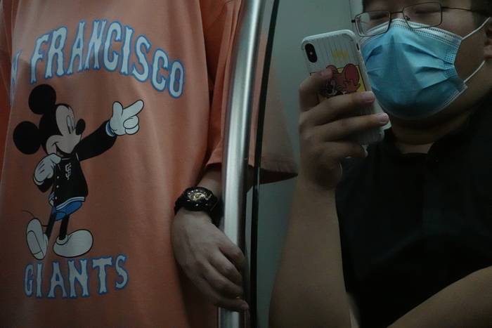 甚至要加上意念力。所谓“意念”,就是因无法摆拍而对拍摄目标作出合乎拍摄角度的想象力。地铁里,年轻女子的体恤衫和相邻看手机男子的手机壳上都是米老鼠图案,但后者的眼睛被手指挡住了,这时,王天抒就在心里急切指挥:手指赶快挪一点,再挪一点!当男子滑屏动作的瞬间,小米老鼠“扒开”指缝,两只米老鼠完成了一次生动的相遇。