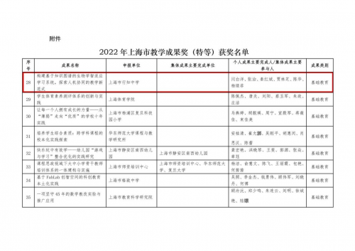 2022年10月,上海市教育委员会公布了上海市教学成果奖获奖名单,其中,由吴淞中学副校长闫白洋博士与团队共同完成、高木学习提供技术服务的《构建基于知识图谱的生物学智适应学习系统,探索人机协同的教学新范式》荣获上海市教学成果特等奖,上海市市级教学成果奖由上海市人民政府设立,是目前上海市教育领域政府类最高奖励。