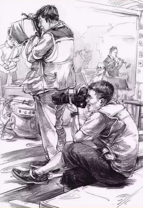 一.构图 场景速写的构图要在动手下笔之前,心中有一个大体的轮廓。在速写进行中,将对象逐一安排在预想的框架中,其中可以根据画面的需要进行单个即兴调整。场景速写往往是将对象依主次关系先后画出,再根据构图的要求和情节的说明添加物体或安排细节,以达到构图丰满完整、节奏强烈有趣的目的。对近景的人物和道具进行深入刻画,对远景的人物和道具进行归纳和概括处理,这样可以使画面主次明确,加强空间的纵深感。