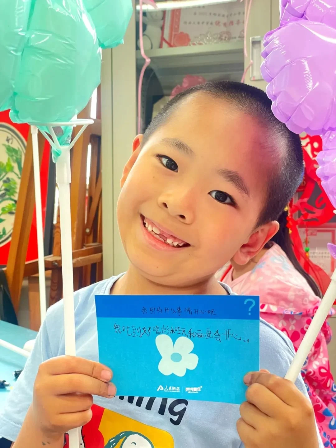 儿童节的意义不仅是庆祝童真,表达童心,更是让人们回味最本初的快乐。大学生们拿到这些充满童心的“快乐”答案,也分享给了路上的行人和本校的同学,将小朋友们用稚嫩笔迹写下的“小确幸”有爱的传递出去。