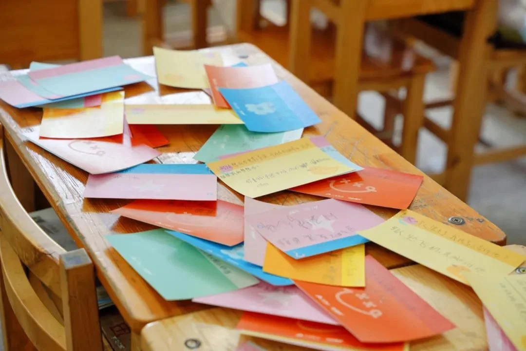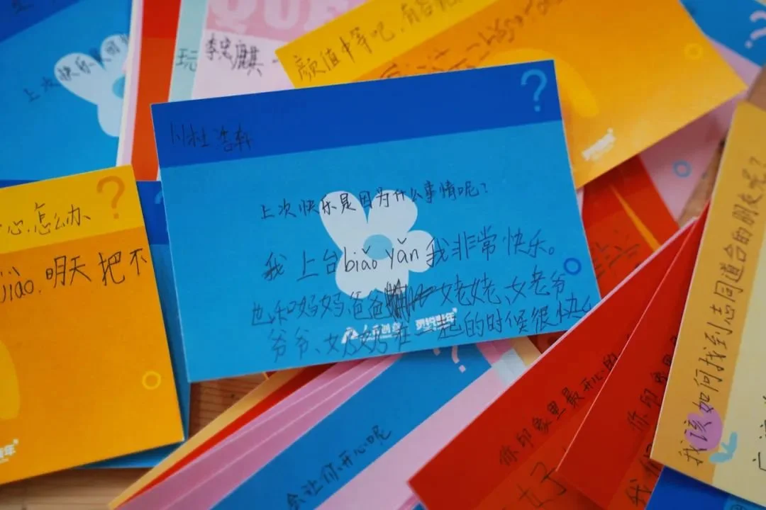 心简单,世界就是童话。活动中,大学生在卡片上写下让自己困惑的学业、生活或者爱情问题,邀请孩子们写下自己的答案。