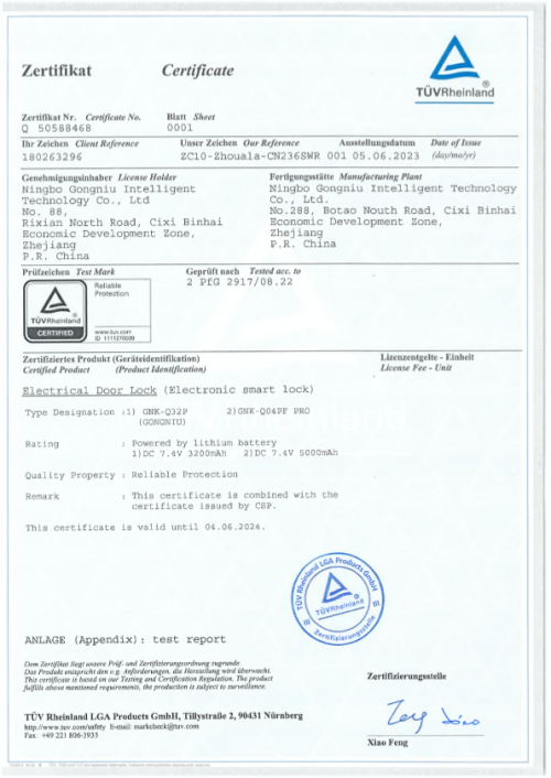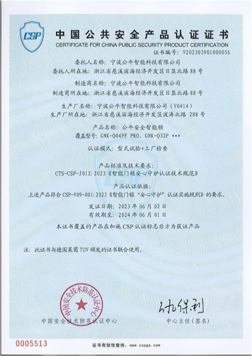 2023年6月7日,中国安全技术防范认证中心、国家安防质检中心(北京)与德国TüV莱茵携手举办智能门锁“安心守护”认证联合颁证仪式,并举行媒体见面会。公牛集团副总裁周正华、公牛智能门锁事业部总经理黄冠等受邀出席仪式。