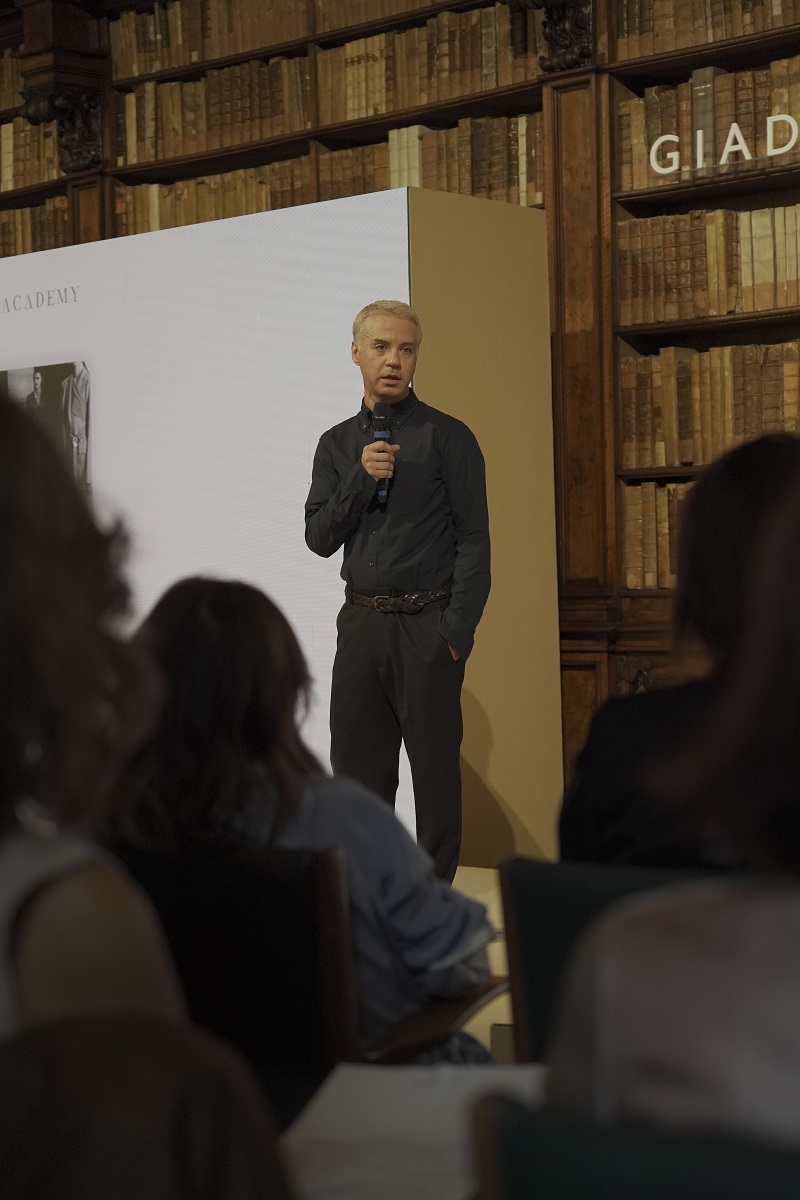 7月3日,这是整场GIADA学苑活动中最浓墨重彩的一天,也是深度体验布雷拉图书馆和美术馆的一天。上午,GIADA创意总监Gabriele Colangelo作为品牌代表发表了欢迎致辞,并且与大家分享他对阅读的理解,他觉得阅读是一种生活方式,同时也贯穿在他所有的设计灵感中。GIADA Lady阅尽人间,依旧坚强但温柔,正如“岩石上的花”,这就是他设计时心目中的女性模样。