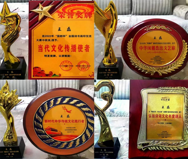 1、2022国都杯全国诗书画印交流大赛银奖、授予当代文化传播使者荣誉称号;2、2022风雅杯新时代诗词美文笔会二等奖、授予中华风雅杰出文艺家荣誉称号;3、2022翰墨风华全国诗书画大展赛一等奖,授予新时代中华传统文化践行者荣誉称号;4、2022晋唐杯全国诗书画家创作赛一等奖、评为晋唐最佳创作奖;5、2022四海杯海内外诗联书画邀请赛金奖;6、2022神州颂全国诗书画家作品年赛一等奖,评为2022年度诗书画精英奖;7、第二届三亚杯全国文学大赛金奖,评为年度最美诗歌;8、第六届雅集京华·诗会百家一等奖,授予弘扬诗词文化年度诗人荣誉称号;9、首届大美东方全国诗书画作品大赛金奖;10、2023风雅杯新时代诗词美文笔会一等奖;11、第十届相约北京全国文学艺术大赛一等奖;12、第二届“右军杯”全国诗书画家作品邀请赛二等奖等。