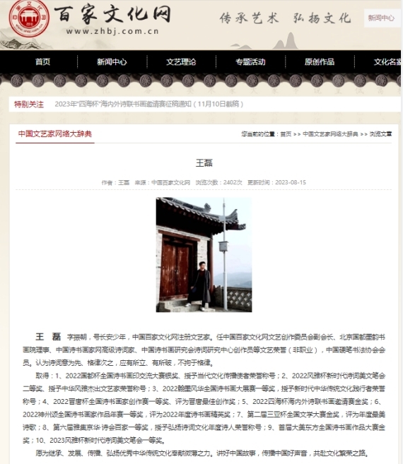 2022年12月16日发表《新时代诗人命运共同体论》、2023年3月7日发表《韵与学诗、作诗论》两文于中国百家文化网文学理论板块。