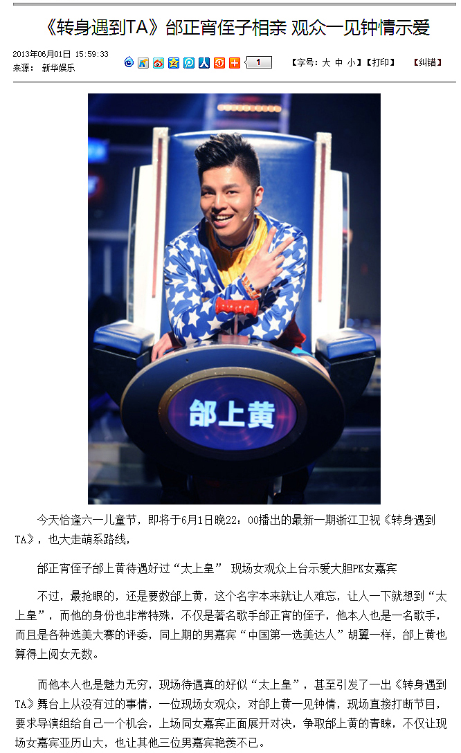 2013年携新歌《情歌魅影》登上浙江卫视“转身遇到Ta”节目,被现场观众登台求爱的“求爱门”事件使该期节目后来成为年度收视率冠军,也是在这期节目中被浙江卫视曝出邰上黄是邰正宵侄子的身份,邰上黄在节目中演唱了改编版《可惜不是你》、《情歌魅影》和《蓝色爱情海》、张信哲《做你的男人》、猫王经典《Love Me Tender 温柔的爱我》,牵走了美女DJ音乐人Zoe叶子;登上东方卫视“梦立方”节目,嘉宾搭档好友为中国第二代人体模特一姐优璇(吕天);拒绝了“中国好声音2”的参赛邀约;于北京成立“星辰实验室”美式复古录音棚。