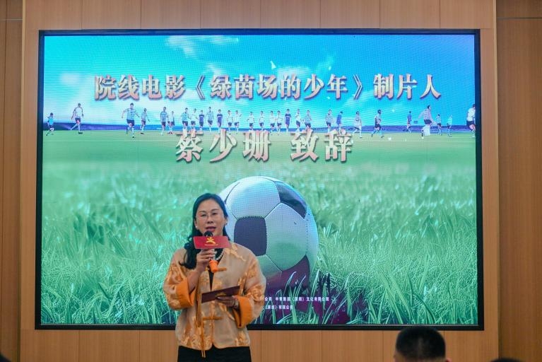 本次活动中,儿童电影《绿茵场的少年》剧组代表人刘威就该电影的创作背景、故事内容、主创人员、演员及电影目前的进度进行了介绍,出品人兼制片人蔡少珊为此也进行了发言,她表示《绿茵场的少年》目前处于剧本筹备阶段,等影片登录影院放映后,将继续向中国电影基金会、中国电影文化传承专项基金捐赠校园播放权。