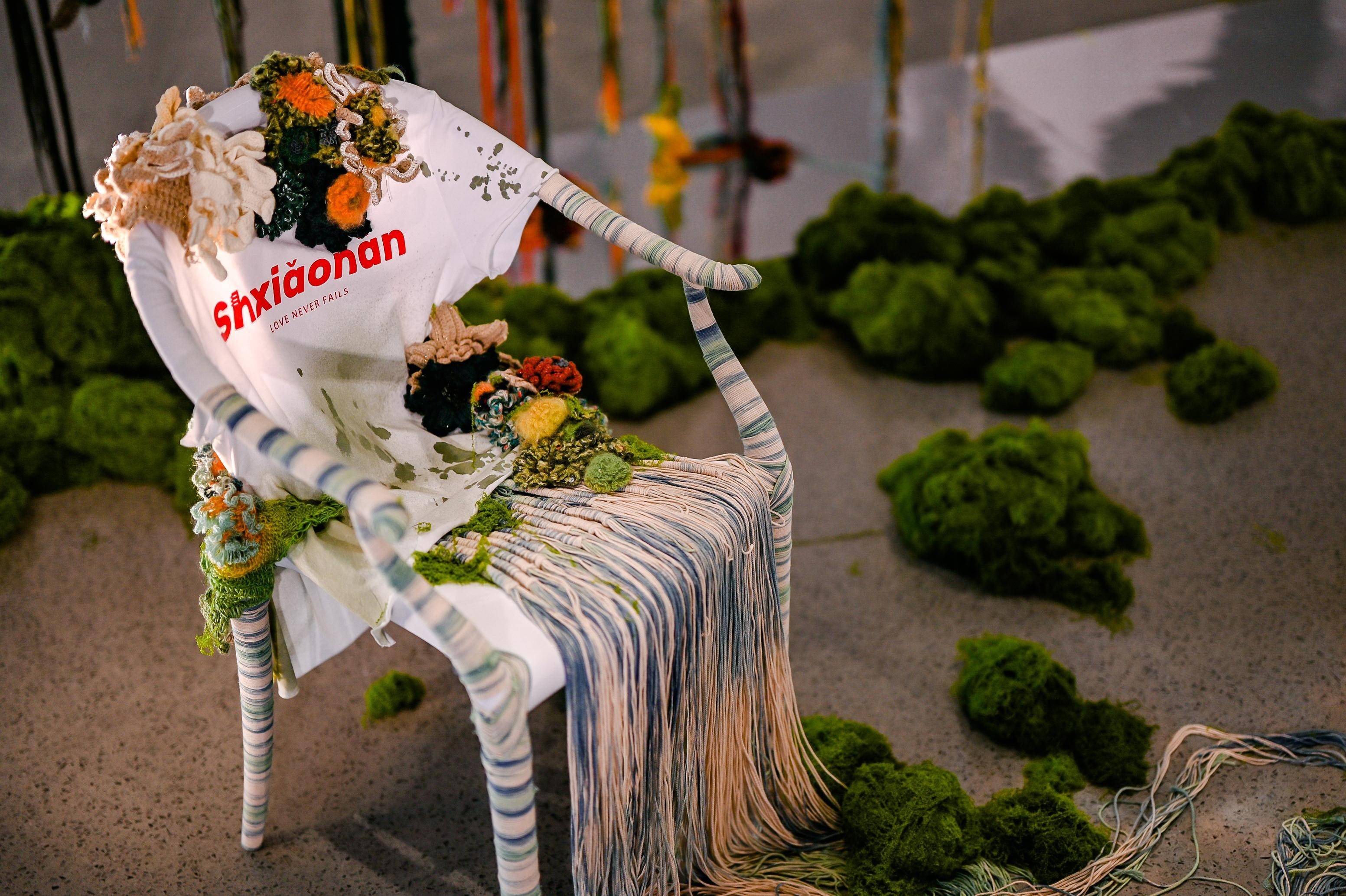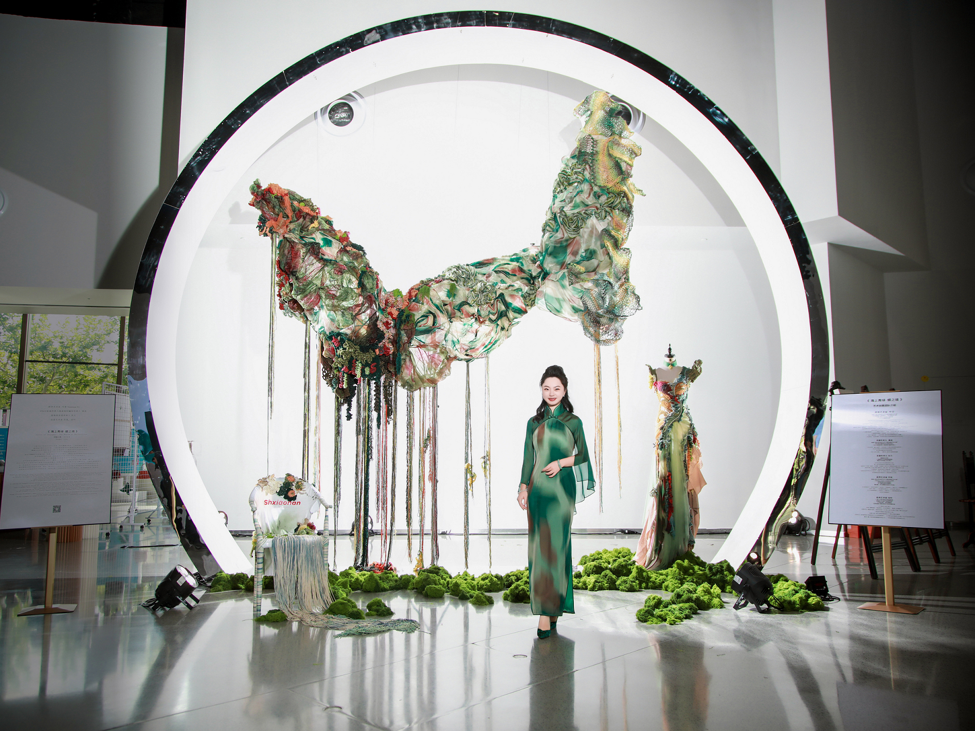 一个高5米的环形镜面装置,两只巨型蝴蝶“盘旋”其上;一件新中式旗袍礼服,在非遗海派钩针技艺的“环绕”之下,编织着一场“梦”;一把融合了植物染T恤和非遗海派钩针技艺的白色新中式椅子艺术作品放置其间,呼唤来到这里的人驻足一刻,一起做一场人与自然的梦。