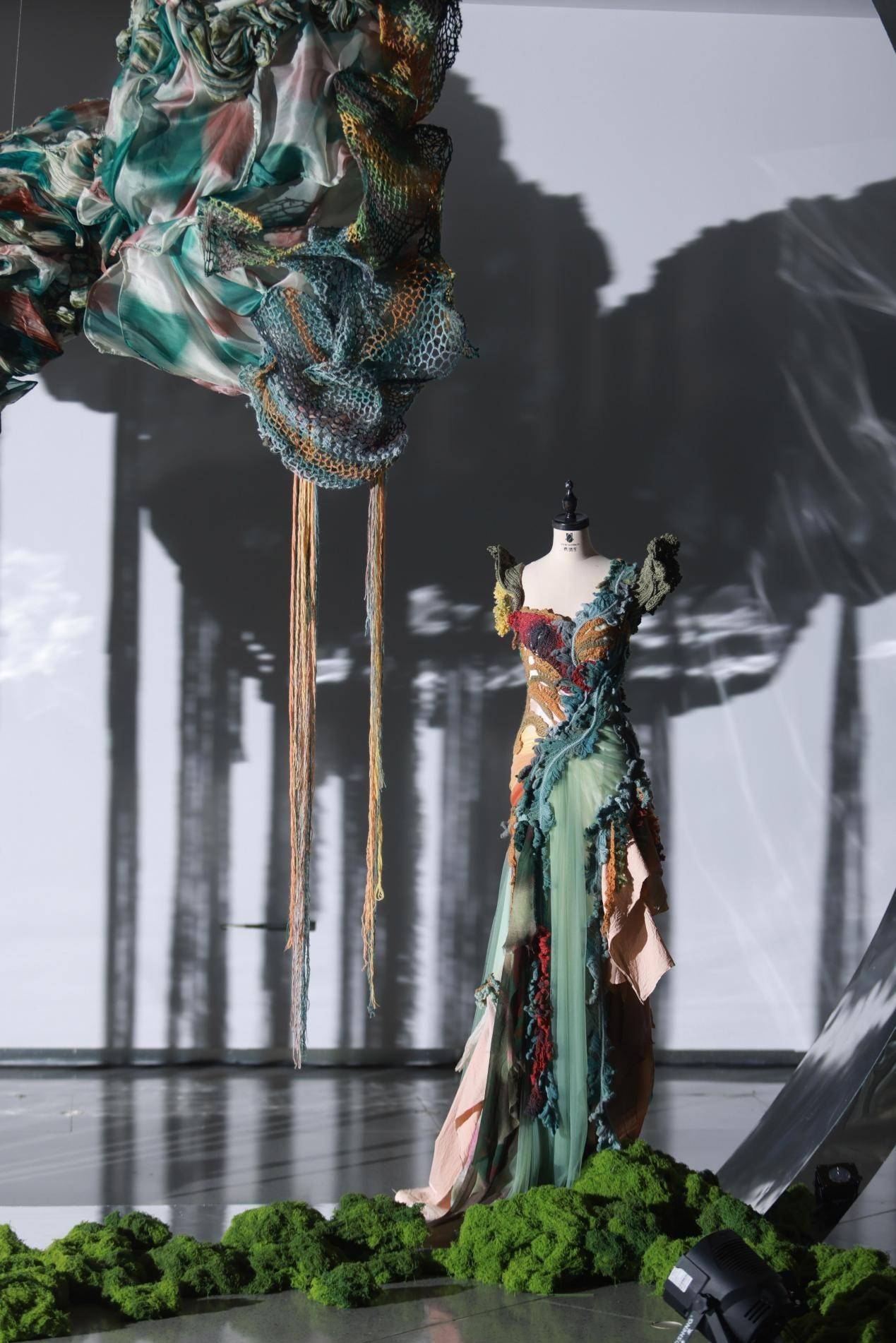 在今年的艺术节上,叶青还带来了两个系列的服饰艺术作品:有用环保植物染色与热转印技术相结合的“天然·蝶梦”;还有废旧布料再造与旗袍套结工艺相交织的“再造·蝶梦”,它们共同构成了此次的蝶梦系列环保服饰。