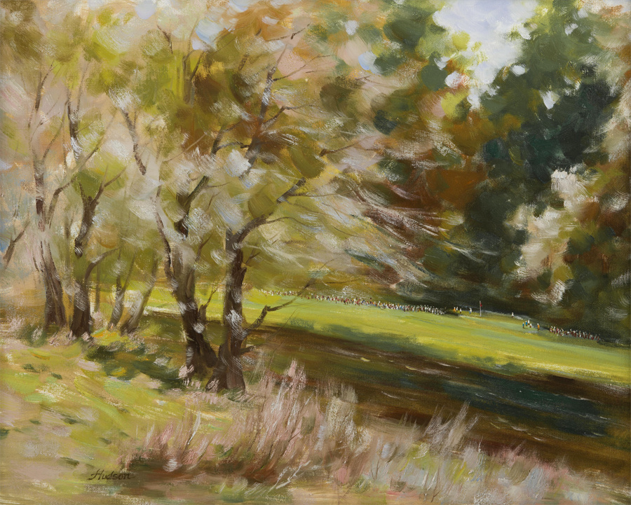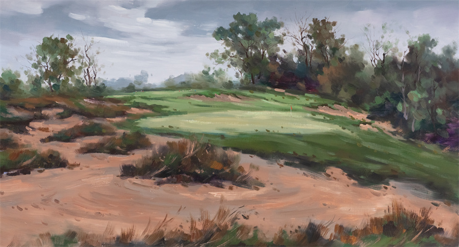 在艺术史上,不少艺术家选择离开艺术中心去寻找新的道路,如梭罗避开巴黎的繁华,在瓦尔登湖发现了自然中花草的美好;如南加州的艳阳与好莱坞的泳池造就了标志性的大卫·霍克尼。张少侠教授选择运用变幻的球道、标志性的果岭、独特的障碍等高尔夫元素来组成一幕幕倾注热血的球场风景,不断尝试打破传统风景画的既定规则,在创作道路上续写着属于自己的传奇。