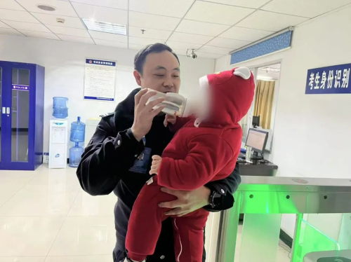 考场外,周福欣变身“临时奶爸”。他温柔耐心地哄着孩子,抱着孩子边走边哄,又是喂奶,又是唱儿歌。在他的悉心安抚下,孩子安安静静地等待王女士考试,并未哭闹。