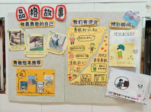中班通过展示幼儿勇敢瞬间与勇敢主题绘本。( 春笋 摄影)