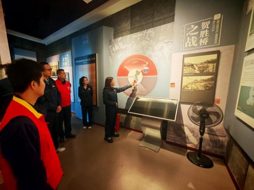 在“鄂电红马甲”队员的引导下,党员们走进贺胜桥北伐烈士纪念馆。馆内陈列了叶挺、许继慎等革命先烈的英勇事迹、贺胜桥战役的攻防示意图、珍贵历史照片以及生动的战役场景壁画,真实再现了北伐战争时期革命先辈浴血奋战的壮烈历程。“鄂电红马甲”队员结合展陈内容,深情讲述贺胜桥战役中革命先烈为民族解放事业舍生忘死的感人事迹,引导全体党员沉浸式感悟红色历史的厚重与革命精神的伟大。