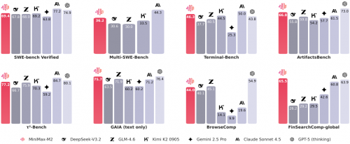 MiniMax M2 在 SWE-bench、Terminal-Bench 等聚焦端到端编码与智能体工具使用的基准测试中表现优异,这些测试与开发者日常工作高度相关。它具备多文件处理、“编码 - 运行 - 调试 - 修复” 完整开发能力,能协同调用 Shell、浏览器等复杂工具链,在信息挖掘、追溯及自我纠错上表现突出,既在基准测试中成绩亮眼,也在生产环境中具备强实用价值。