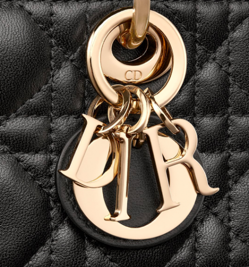 (图注:展示Lady D-Joy 超迷你手袋细节,浅金色 D.I.O.R. 字母吊饰特写,藤格纹绗缝与羊皮革质感的微距特写。)