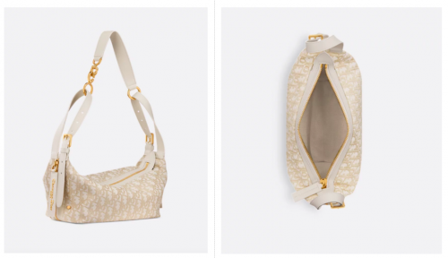 (图注:左:圣诞限定款小号D-Journey 手袋整体展示,金色调 Oblique 印花面料与金链点缀,廓形简约。右:内部空间展示,设计简约典雅实用。)