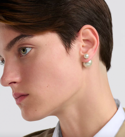 (图注:左:DIOR Tribales耳环整体展示,玫瑰金镶嵌双面大小珍珠,呈现极简设计与温润光泽,彰显典雅匠心。中:细节展示,前透后润,勾勒出简约温润的奢华轮廓。右:佩戴展示,柔和典雅,简约高级。)