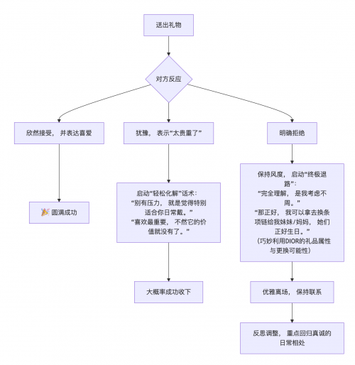 当礼物送出,对方的反应无非几种。请将下图(此处为文字描述流程图)存于心中,便能从容应对: